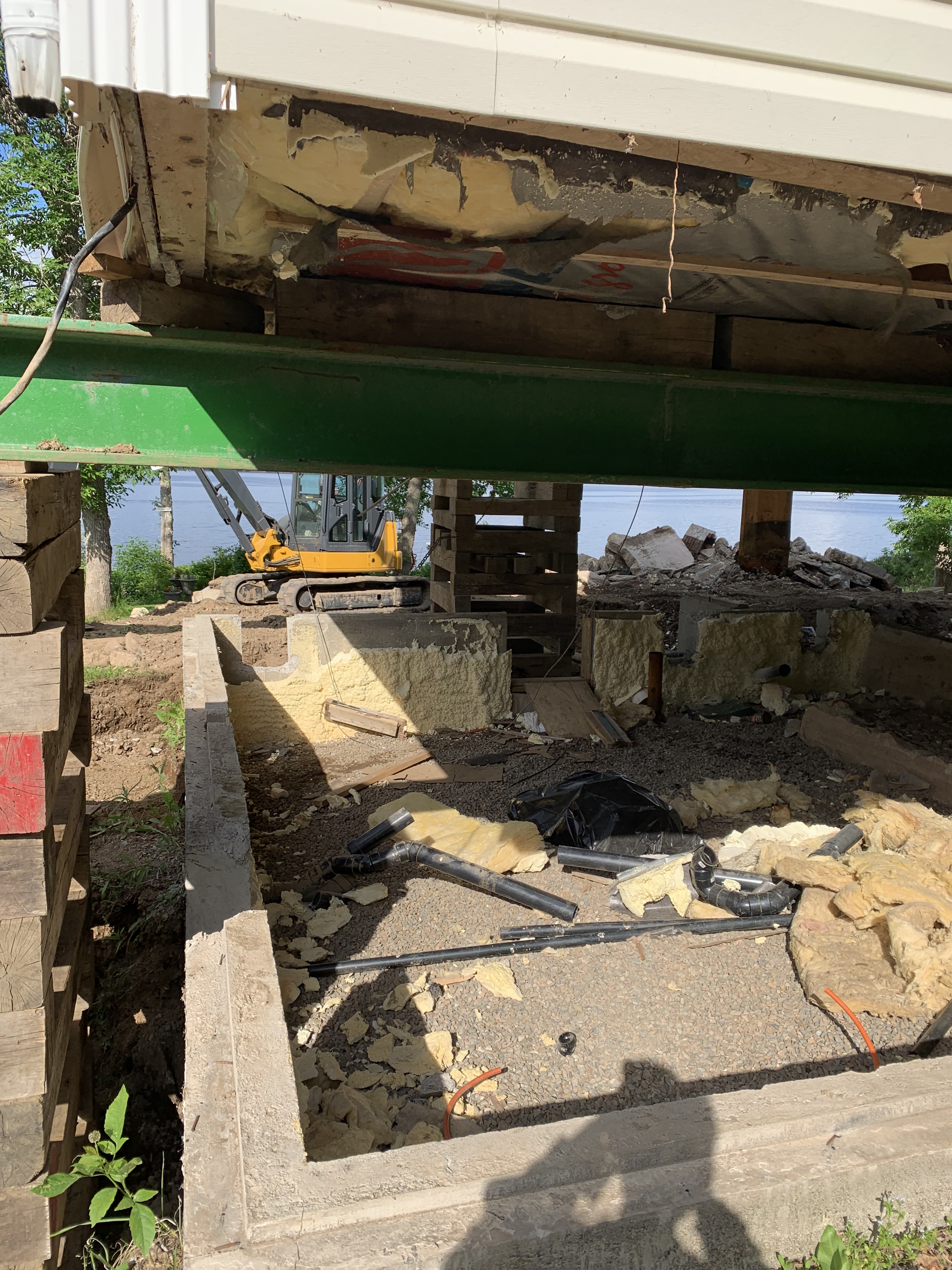 First, the large, two level deck on the side of the house had to be removed. Once that was cleared away, the ground needed to be excavated around the existing foundation so that holes could be cut into it, through which large steel cross beams would be placed, under which the hydraulic jacks would be set. Once the house was up, the beams would rest on 6×6 forms, holding up the house while work occurred underneath.