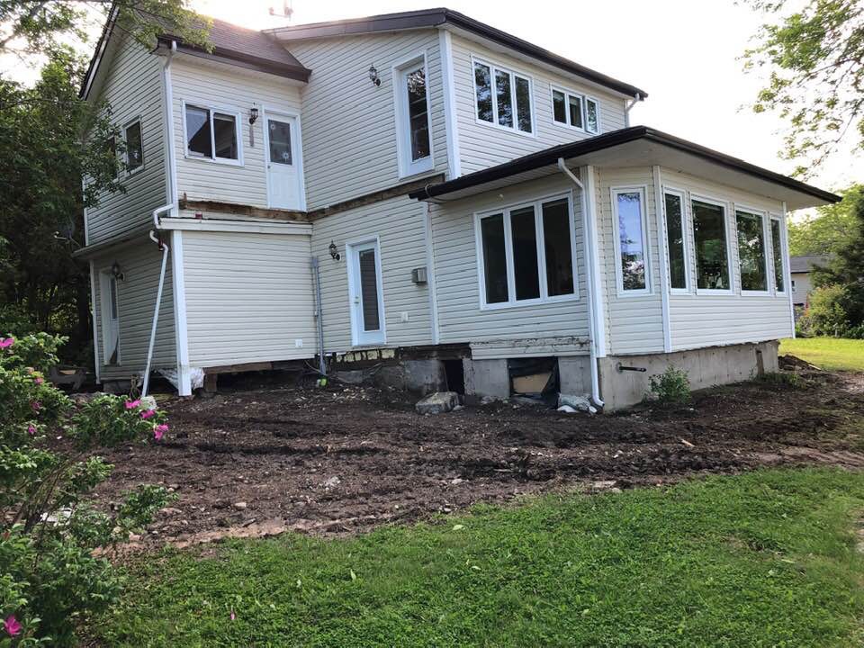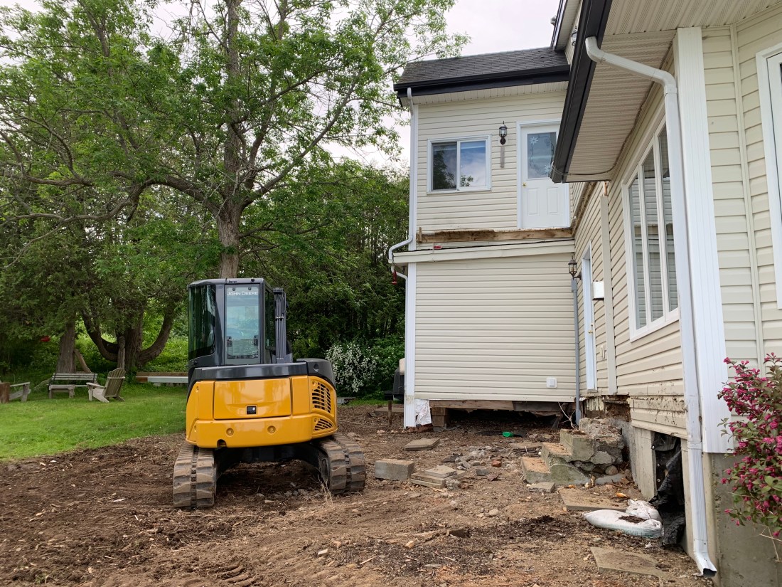 After a visit from the engineer, it was decided that the entire foundation should be redone, with the existing hole under the house to be filled with layers of small and large round rock/pea gravel and compacted dirt (our excavator, Digger Dean, could ‘fill’ you in on those details – check him out on Facebook😉). Additionally, a large French drain will be installed, sloping toward the river onto the beach, before a wall of armour stone is placed to protect the front of the house from wave action. We will be left with a 4-5′ crawl space under the house, sloped and designed for drainage, with sump pits installed in the space and on the wall outside to manage the ground water as it rises.
