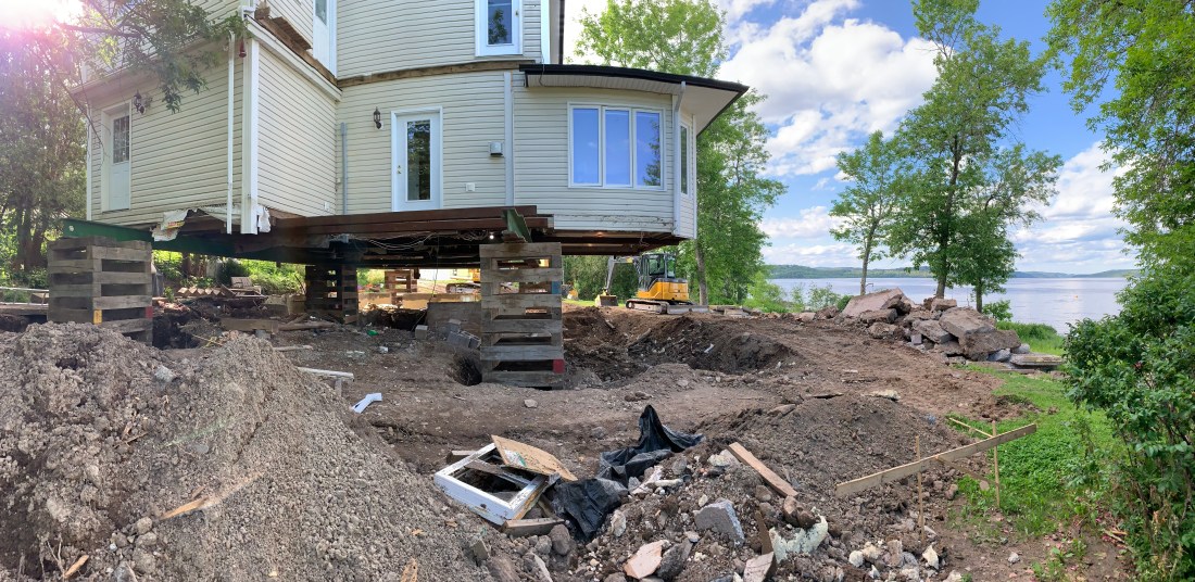 The Quebec company (Heneault Gosselin) arrived in Summerville the next day at 730am sharp, ready to get to work! While I was at work across the river, waiting for news, my friends and neighbours and husband were gathering for the show. We expected it would take the better part of a day to lift a heavy house 5 feet in the air, but my husband, arriving on the 9am ferry, was surprised to find it…..done! The lift took a little over an hour, and the amazing part was that not a dish was disrupted, nor a knickknack knocked over….there was no evidence the cottage had been moved except for two small cracks at the corner of a door sill and, oh yes, the fact that you now had to enter the back door via a fully extended ladder!
