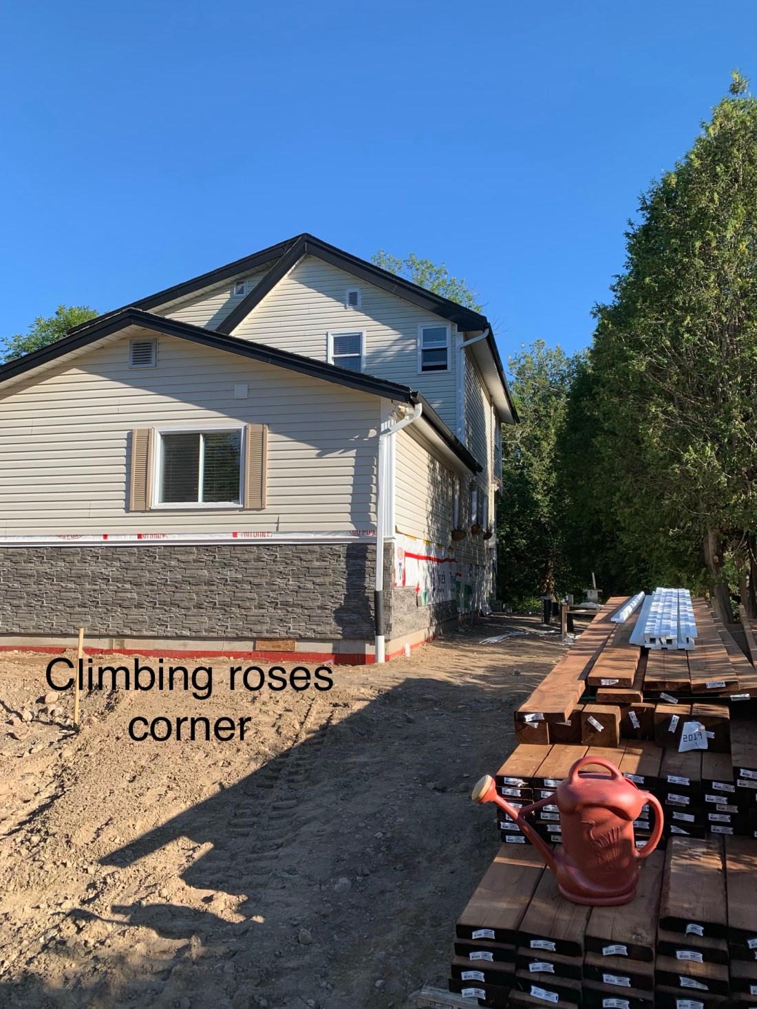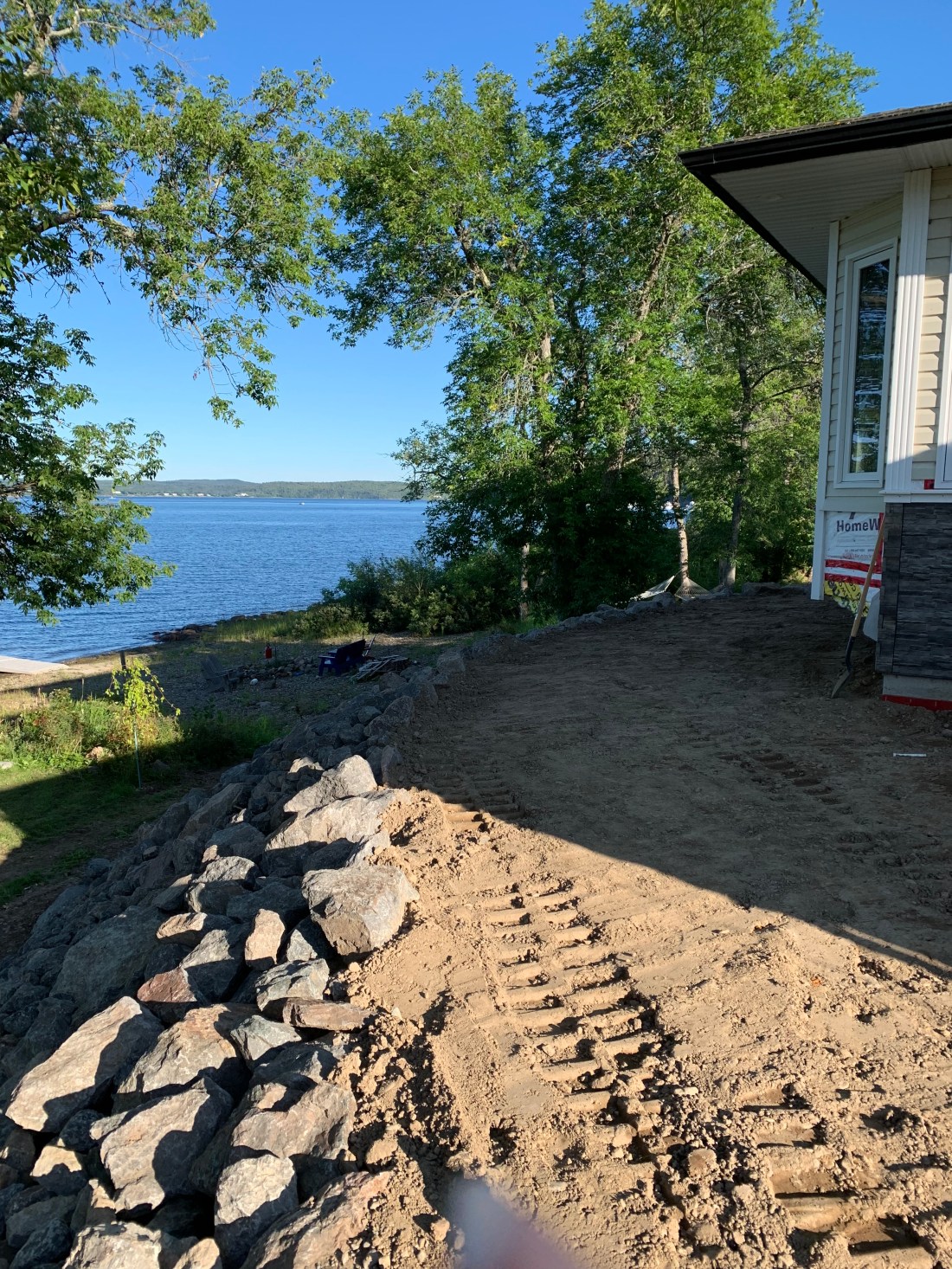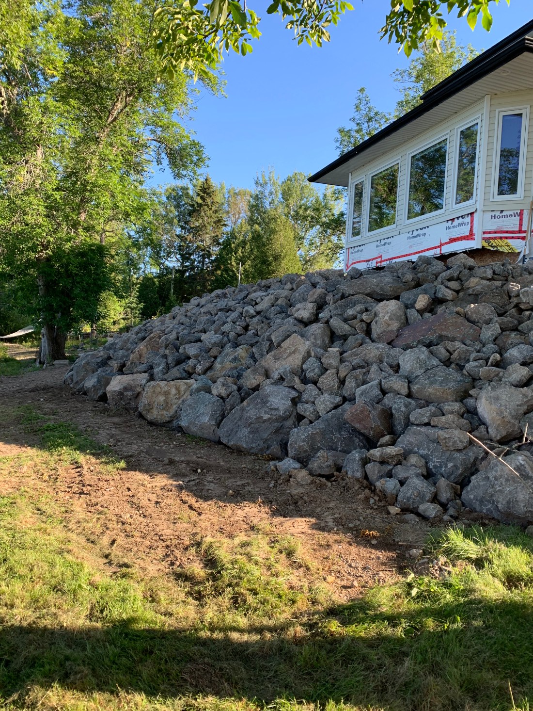 This will all be levelled and tamped with a pea-gravel path and plantings along the foundation walls and top of the rock edge