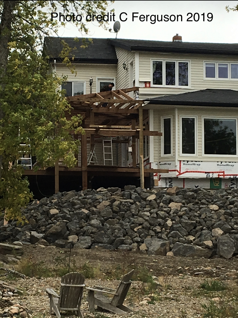 Finally, after removing the former deck, a new one had to be built. And it is solid. Under the skilled hands of Joe Bonnell, a 2-level, 2000 square foot wraparound deck with a verandah is taking shape. The centrepiece is a thirty foot tree rising through the deck floor; no doubt the stress of it all has been hard on the old beauty, but, fingers crossed, she will survive. We hope this great living space becomes a draw for friends and family to enjoy music and movie nights and the East Coast Lifestyle.