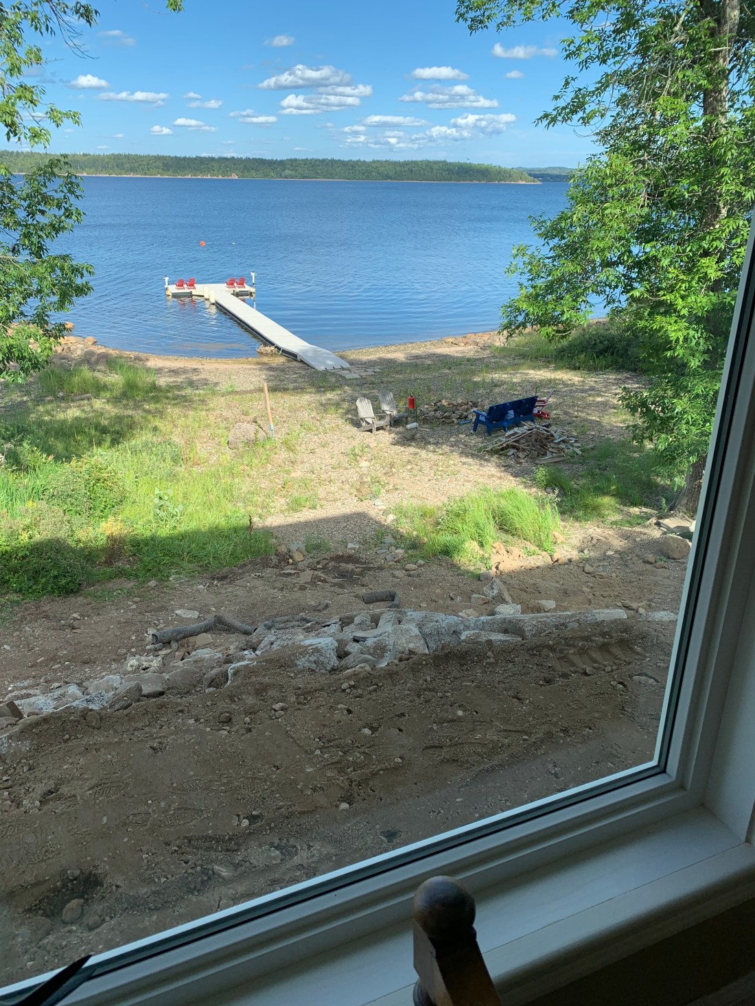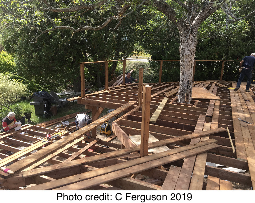 Finally, after removing the former deck, a new one had to be built. And it is solid. Under the skilled hands of Joe Bonnell, a 2-level, 2000 square foot wraparound deck with a verandah is taking shape. The centrepiece is a thirty foot tree rising through the deck floor; no doubt the stress of it all has been hard on the old beauty, but, fingers crossed, she will survive. We hope this great living space becomes a draw for friends and family to enjoy music and movie nights and the East Coast Lifestyle.