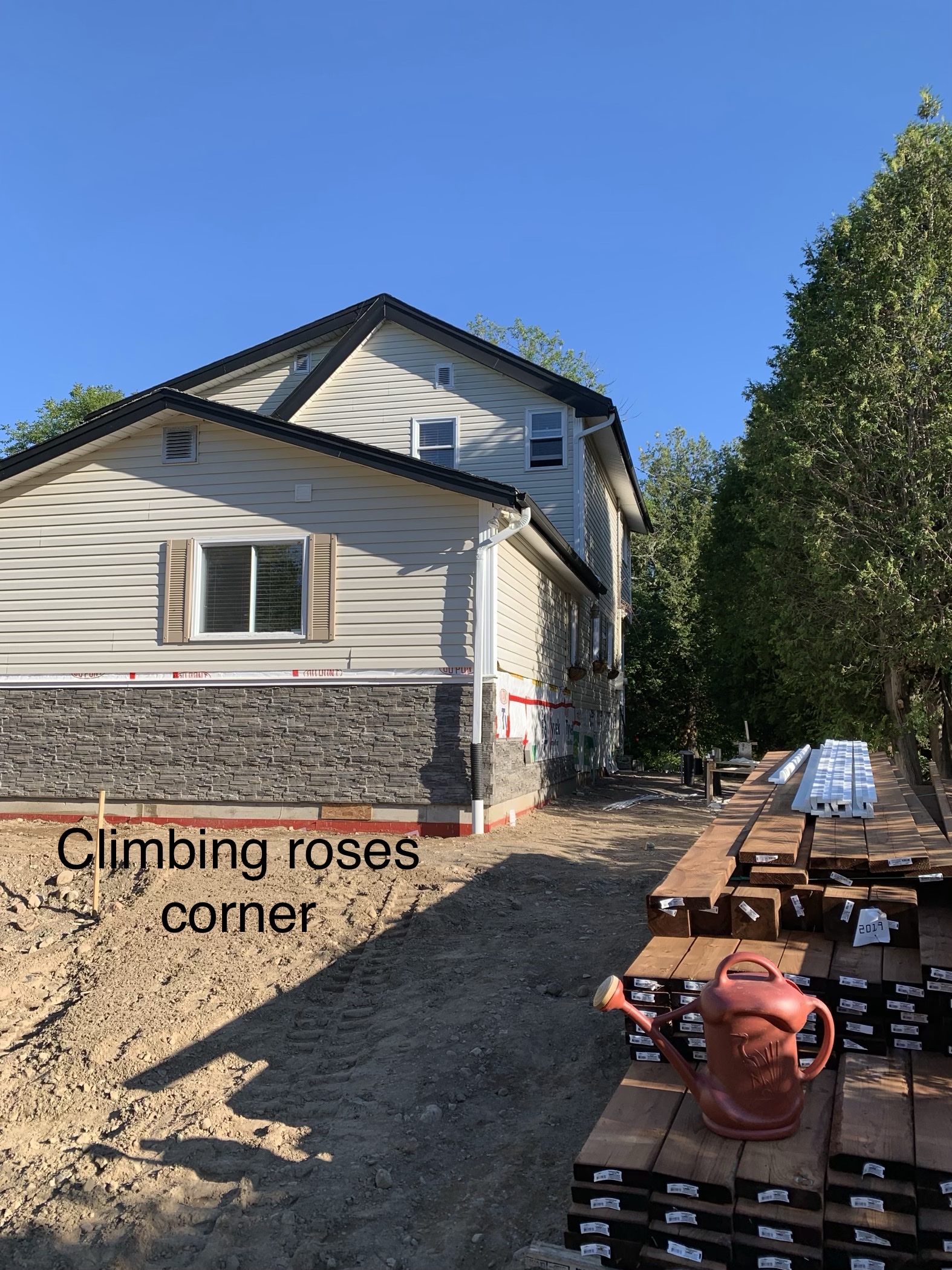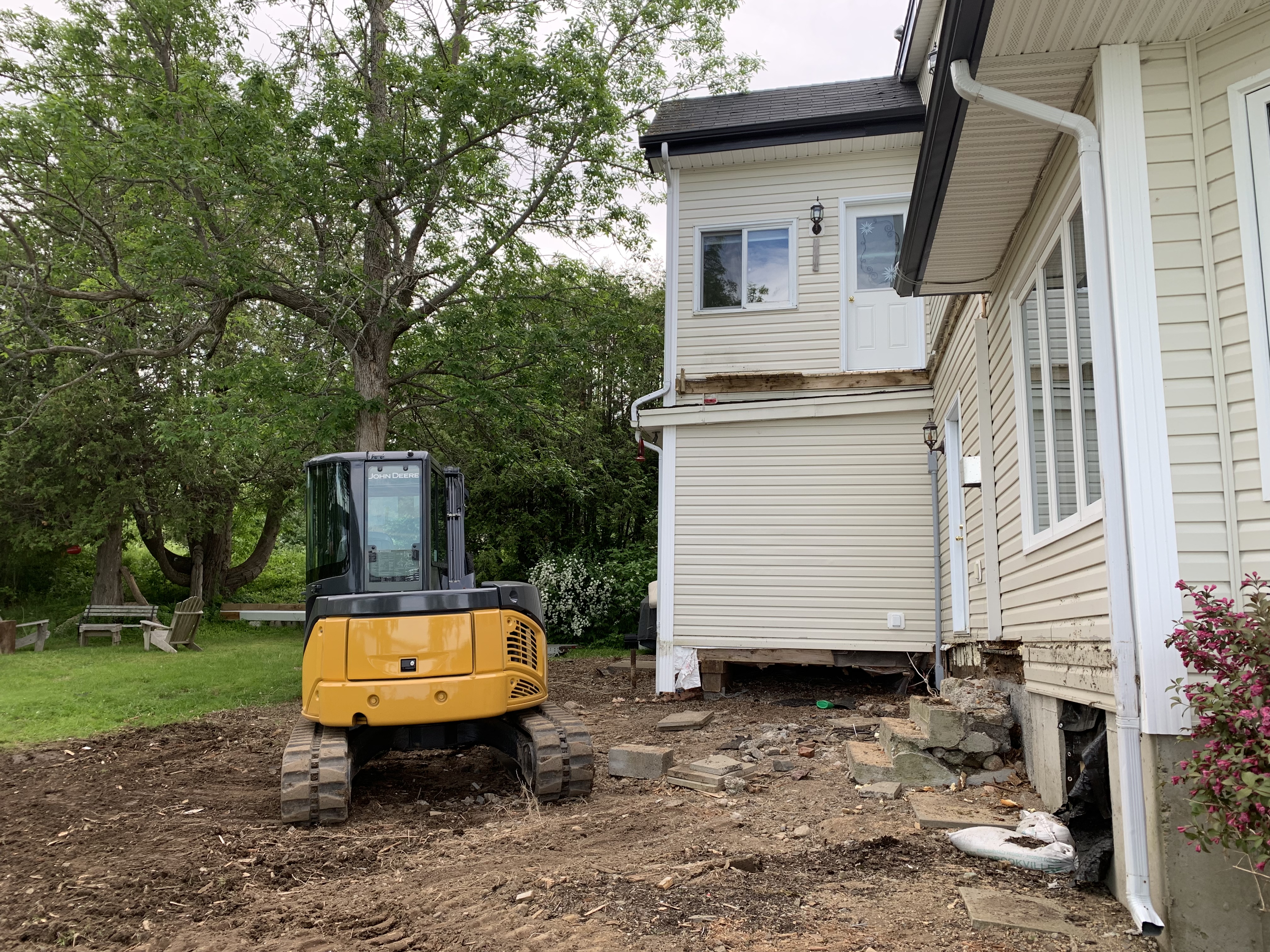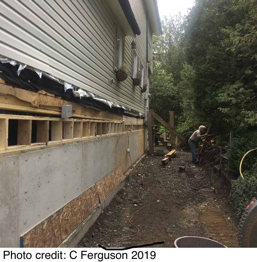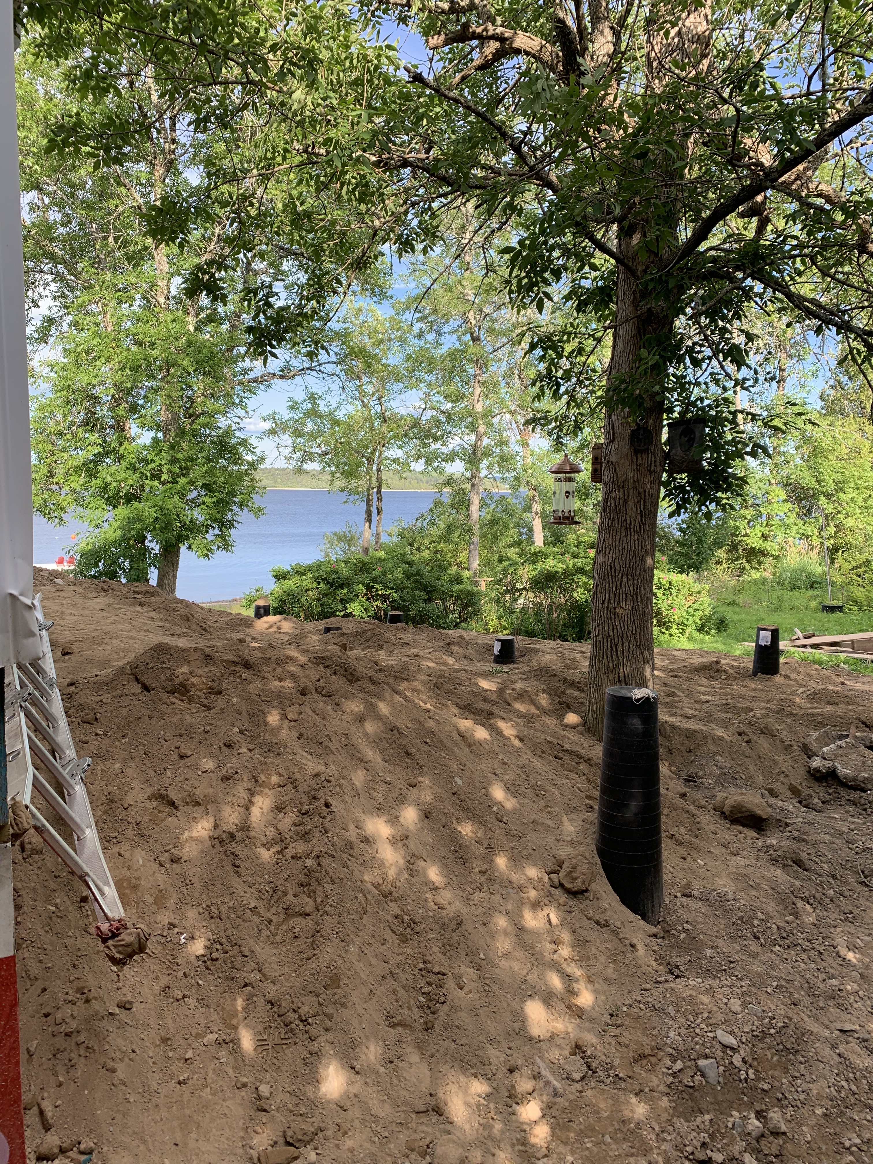 Rob Dean has been busy crafting the landscape with his excavator while the ground crew has been hard at work below. All of the soil had to be packed down and the three sump pits placed back in at the front corners and the centre of the cellar (now a five-foot crawlspace).However, thanks to the fill, the ground is now considerably higher than it was pre-2018 and packed so tightly that we may not get the ground water that we traditionally got (the extent of which depended on that particular year’s water level).