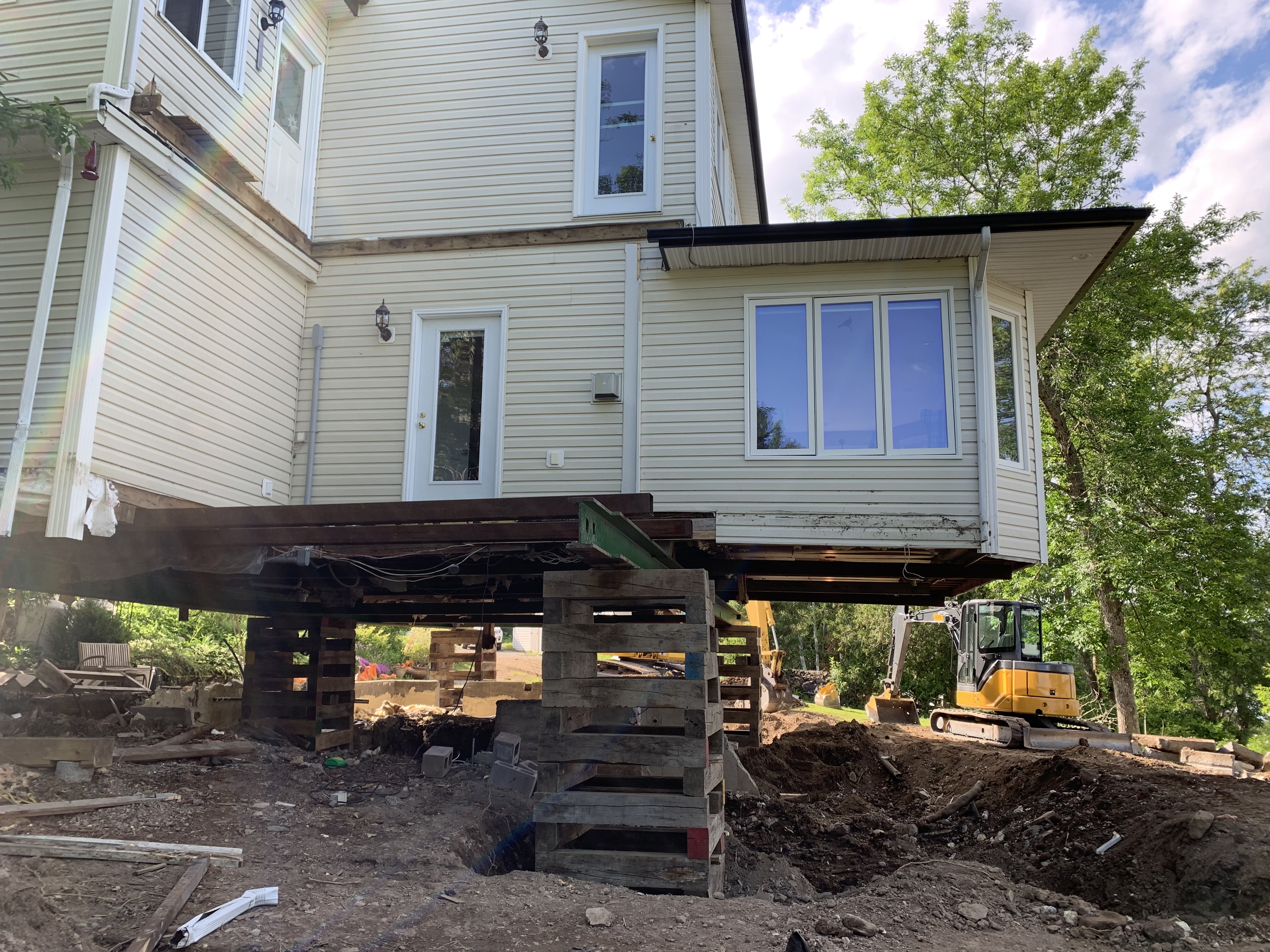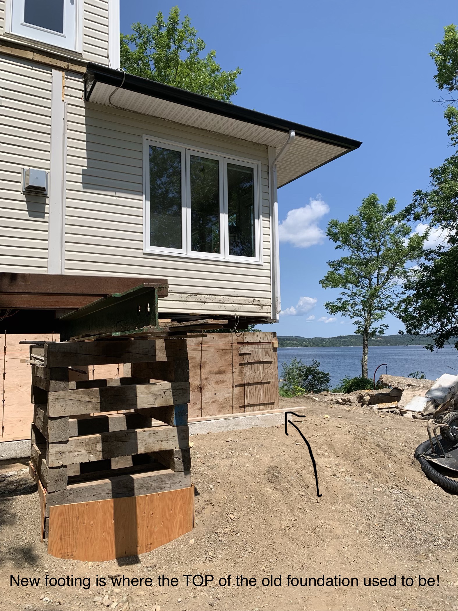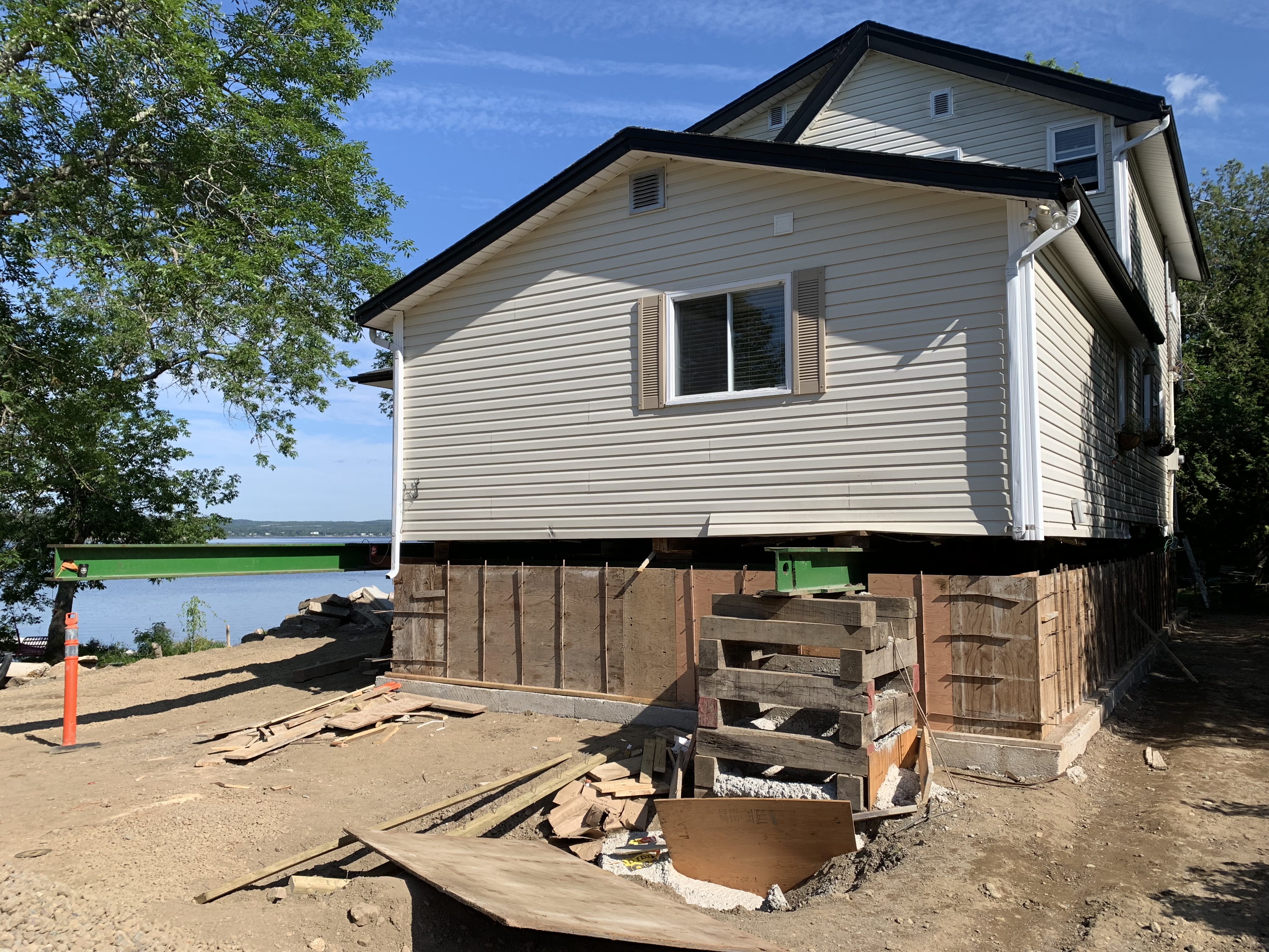 The footing course is done and the forms have been built for the foundation to be poured in the next few days, along with the 28 or so Big Foot supports that will anchor the new deck and verandah. Earlier this week, the crew noticed the steel support beams holding up the house were starting to bow under the weight and so it was JoAt to the rescue with extra jack posts! All is now well-supported and it’s time once again to move ahead. Once poured, the foundation will set until Heneault Gosselin arrive the week after NB Day to lower the cottage onto its new base ๐.