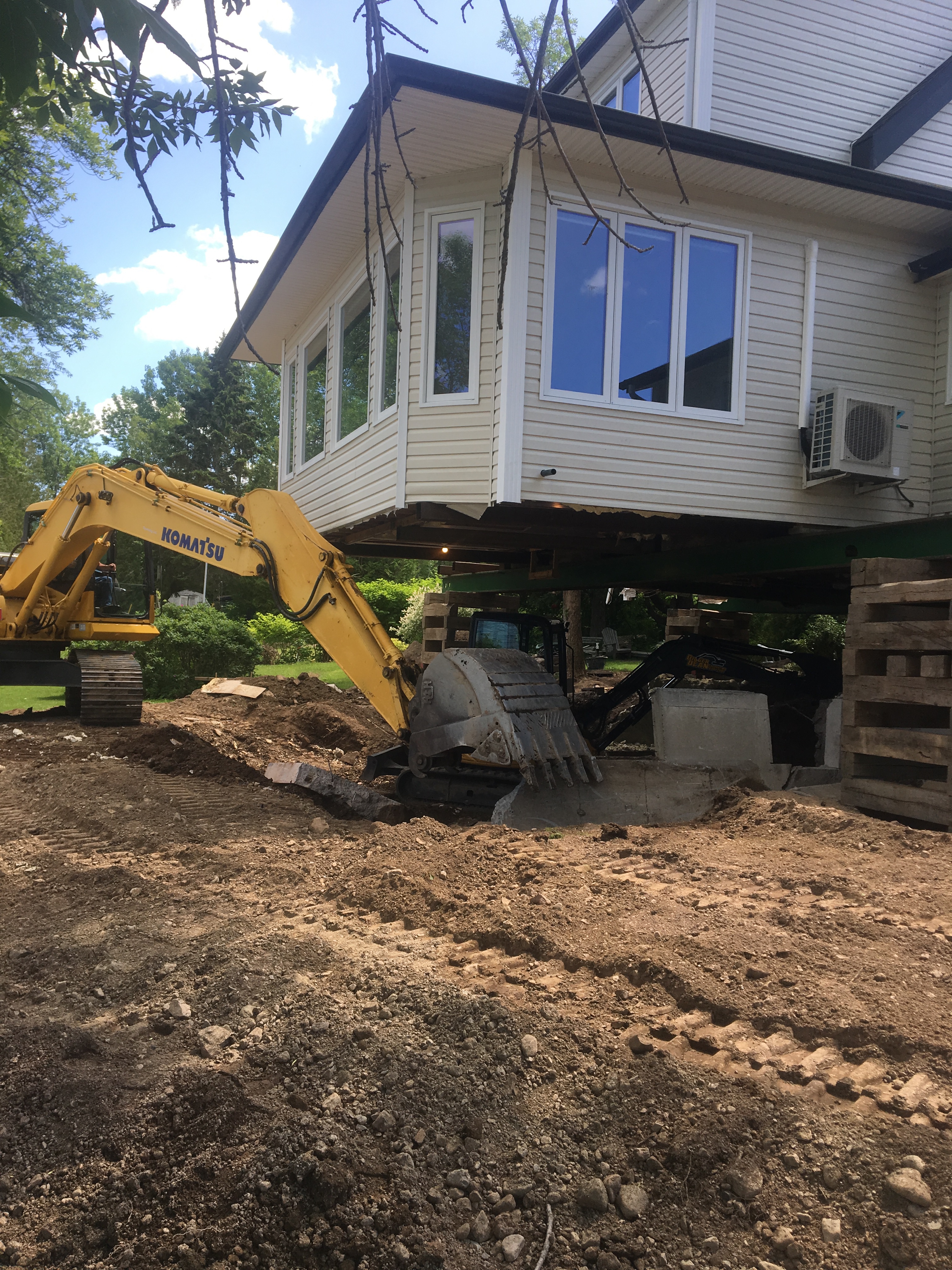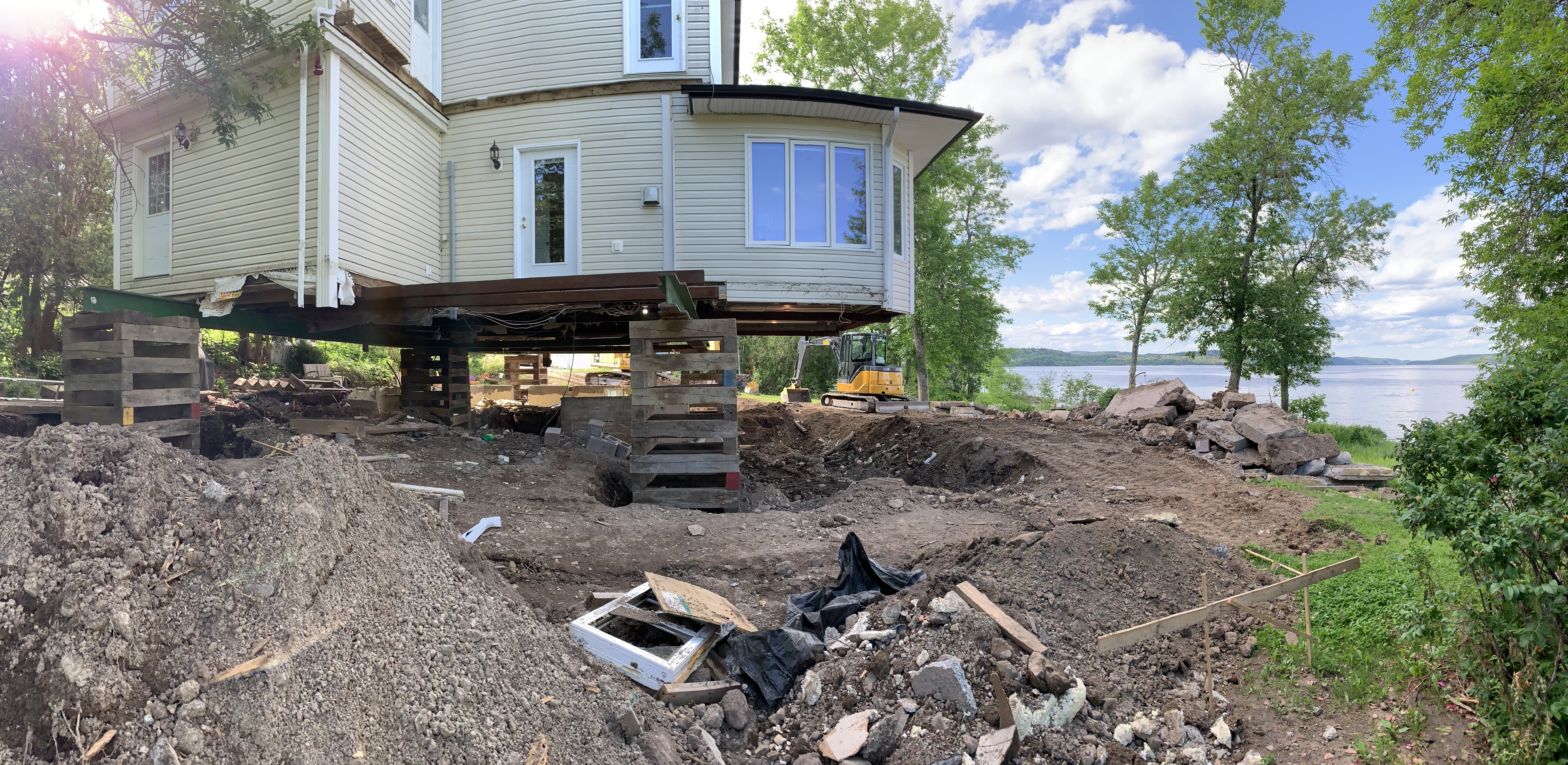 We started prepping the cottage for raising on July 2; Heneault et Gosselin arrived the following week to perform the work. They are scheduled to return tomorrow, August 19, to lower it back down. A great deal of work has been done during that time. As you read in a previous blog post, Robbie Dean spent many hours excavating and shaping the land – the entire property has come up about 3-4 feet before the new foundation was poured.