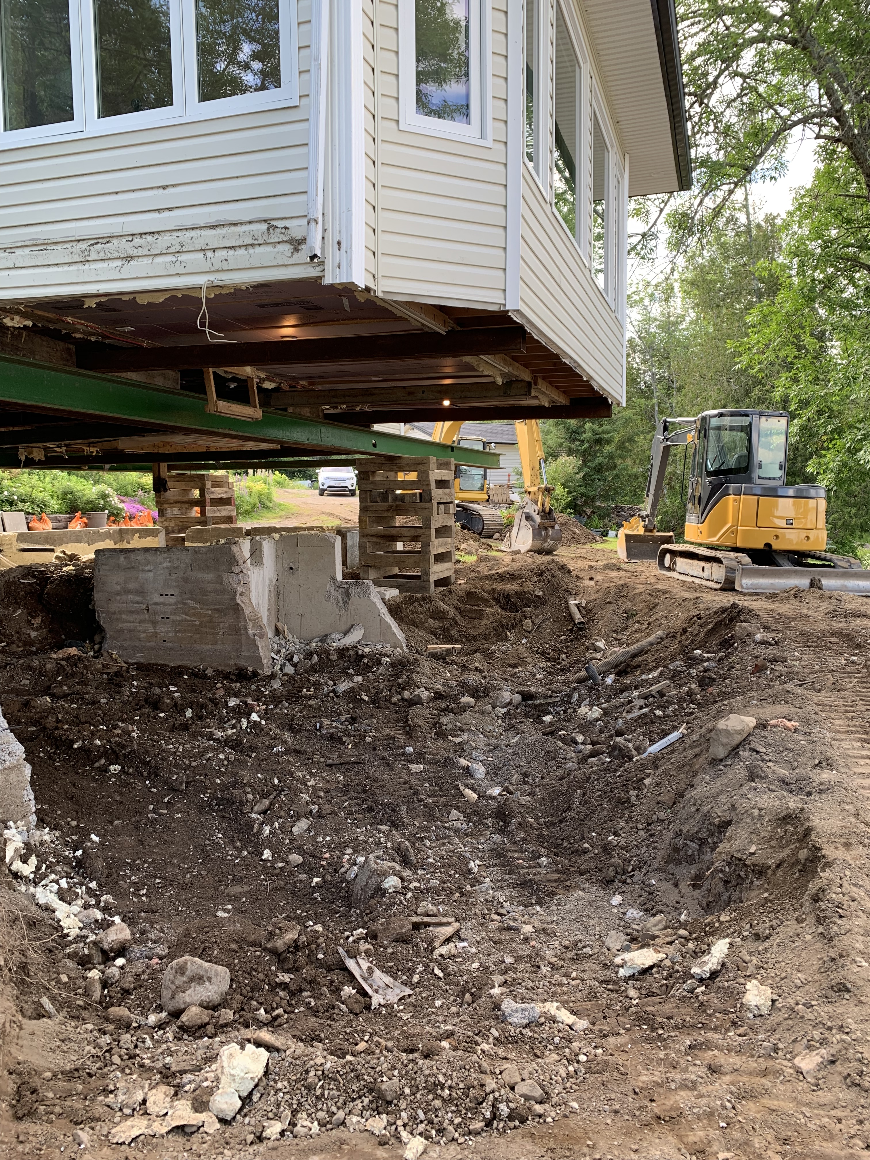 First, the large, two level deck on the side of the house had to be removed. Once that was cleared away, the ground needed to be excavated around the existing foundation so that holes could be cut into it, through which large steel cross beams would be placed, under which the hydraulic jacks would be set. Once the house was up, the beams would rest on 6×6 forms, holding up the house while work occurred underneath.