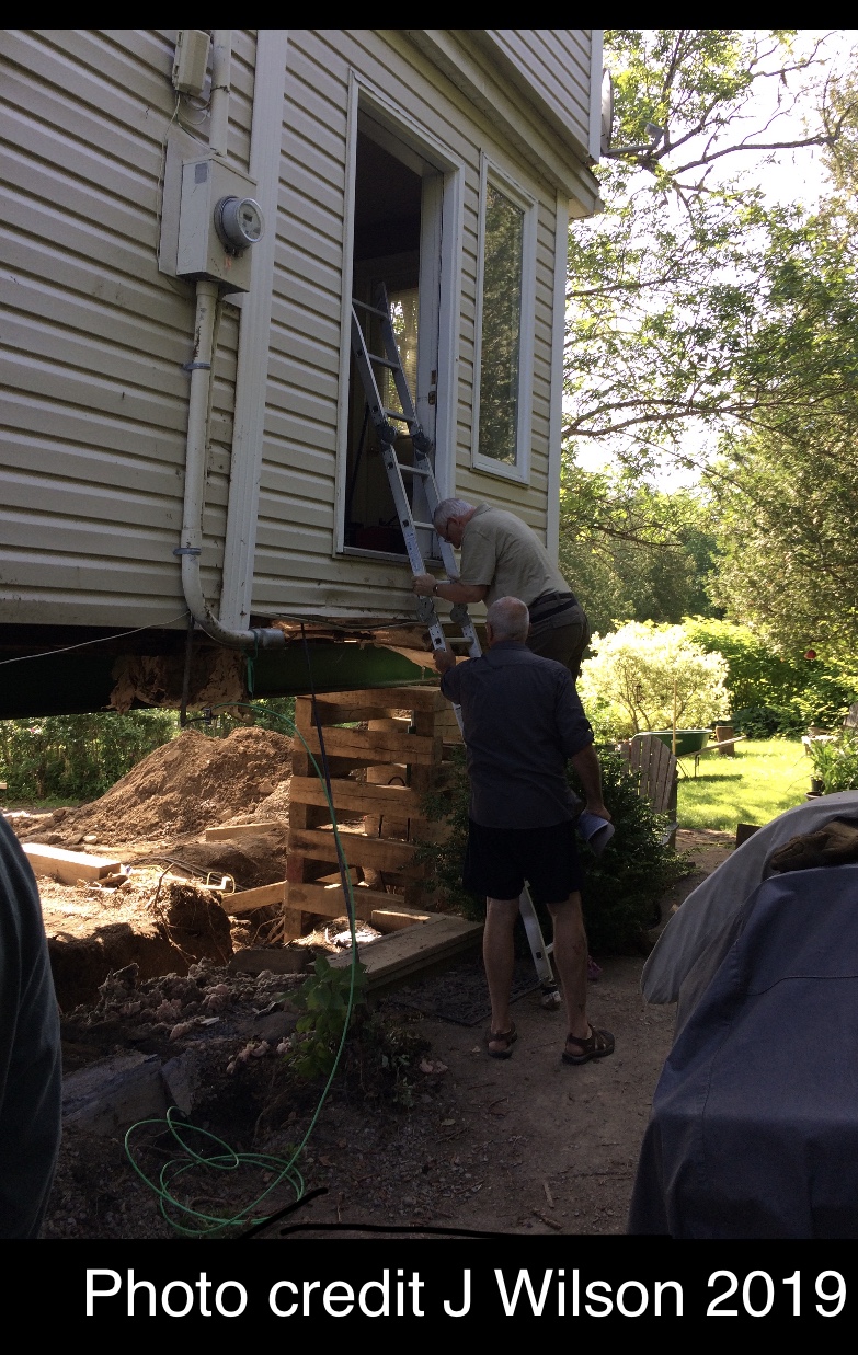 The Quebec company (Heneault Gosselin) arrived in Summerville the next day at 730am sharp, ready to get to work! While I was at work across the river, waiting for news, my friends and neighbours and husband were gathering for the show. We expected it would take the better part of a day to lift a heavy house 5 feet in the air, but my husband, arriving on the 9am ferry, was surprised to find it…..done! The lift took a little over an hour, and the amazing part was that not a dish was disrupted, nor a knickknack knocked over….there was no evidence the cottage had been moved except for two small cracks at the corner of a door sill and, oh yes, the fact that you now had to enter the back door via a fully extended ladder!