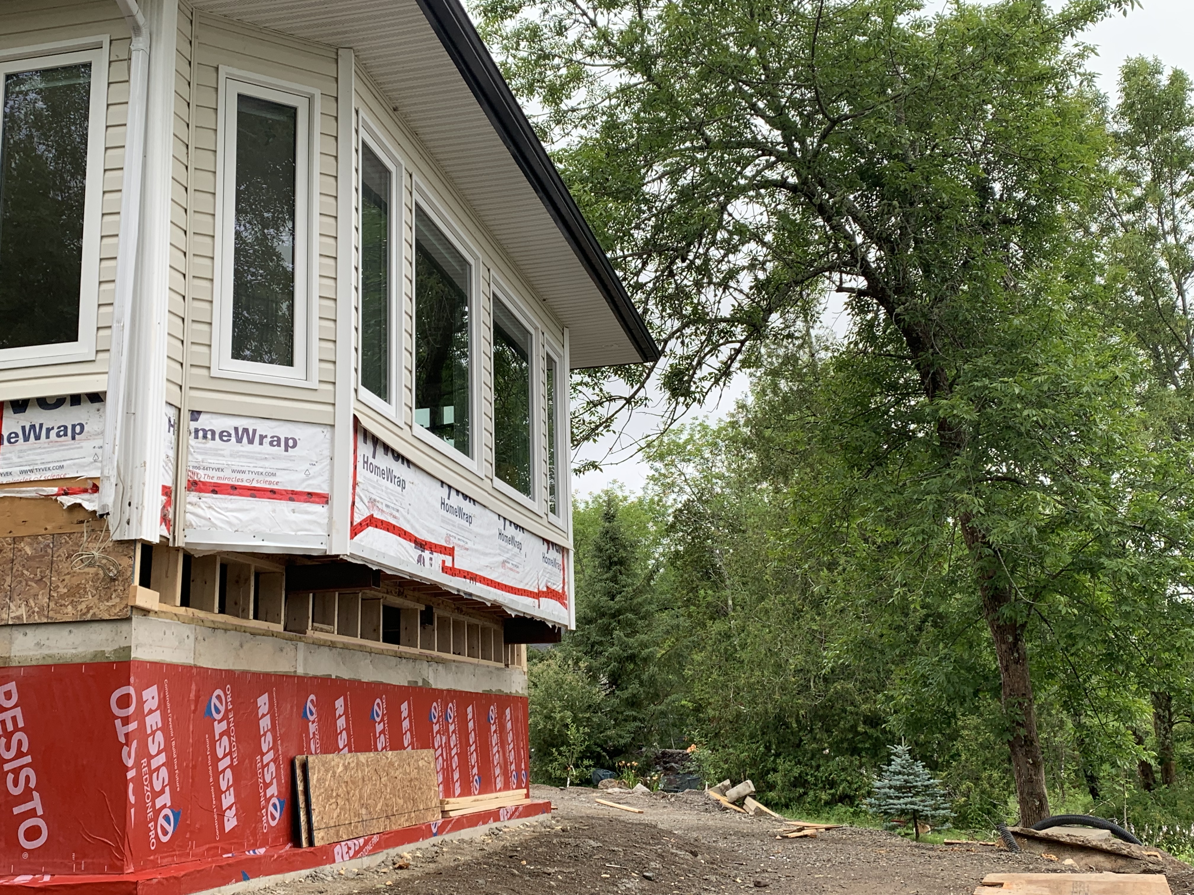 Meanwhile, inside, there is a new, large dry cellar with a gravel floor, all spray foam insulated, with three large sump pits (total pumping capacity 600gal/min). Ground water has always been an issue close to the river, but with the engineered soil-pack, the new elevation and a moisture mitigation strategy, we hope/expect to stay dry (spring and Mother Nature will tell the tale ๐).