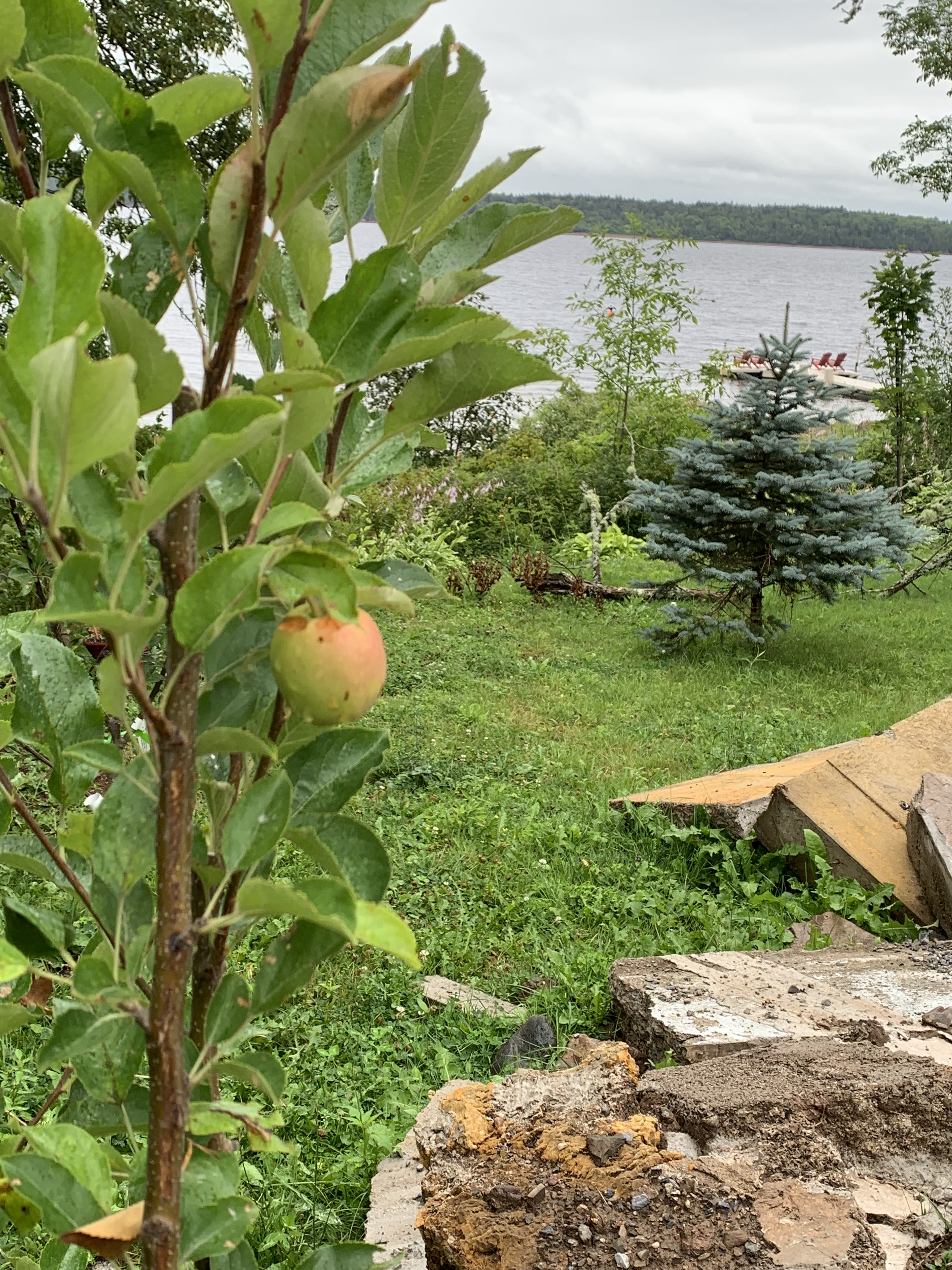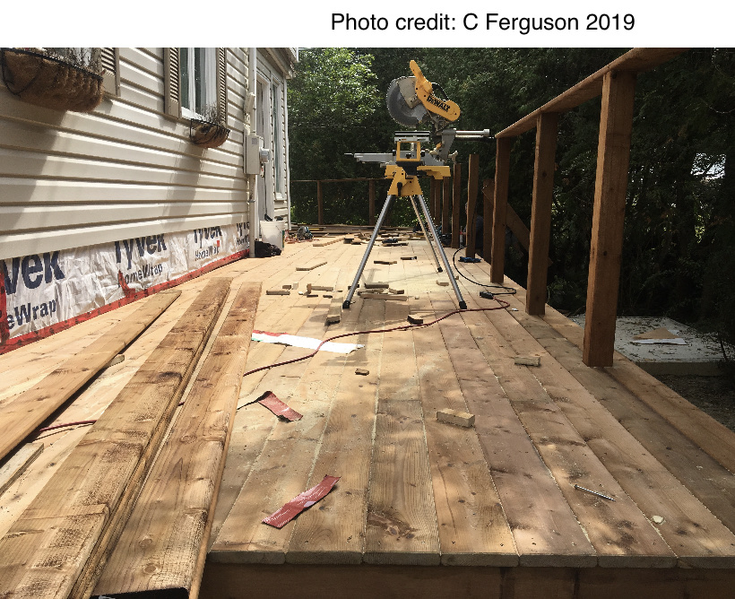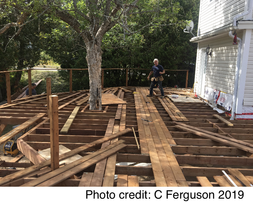 Finally, after removing the former deck, a new one had to be built. And it is solid. Under the skilled hands of Joe Bonnell, a 2-level, 2000 square foot wraparound deck with a verandah is taking shape. The centrepiece is a thirty foot tree rising through the deck floor; no doubt the stress of it all has been hard on the old beauty, but, fingers crossed, she will survive. We hope this great living space becomes a draw for friends and family to enjoy music and movie nights and the East Coast Lifestyle.