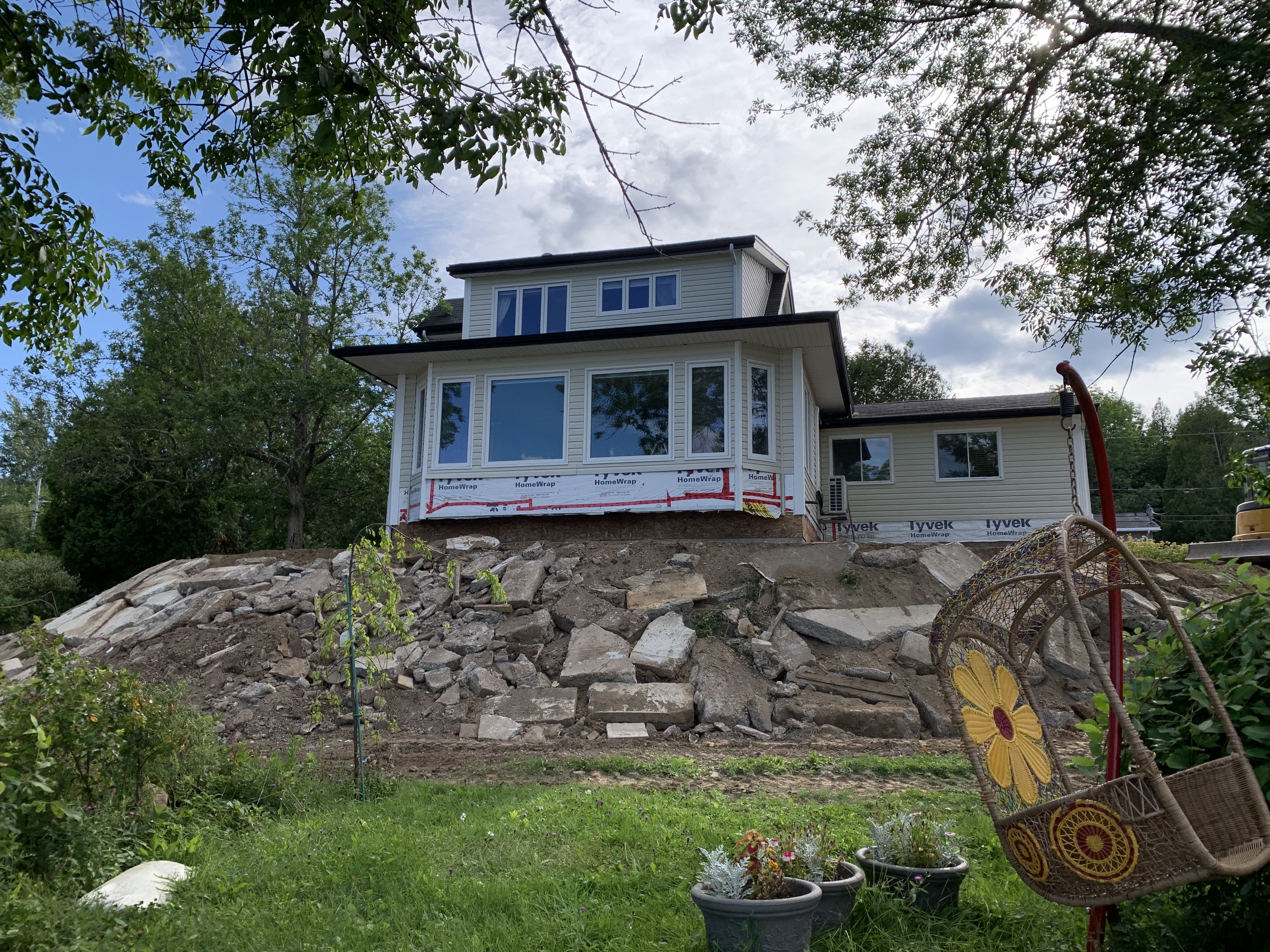 But, it IS exciting! It is amazing to watch this change, and the cottage will be much better protected. Now, if only we can keep the displaced flowers in all those pots watered until we can get them back into the ground when this project is done. Heaven knows, we now have enough dirt to find them a place to live!