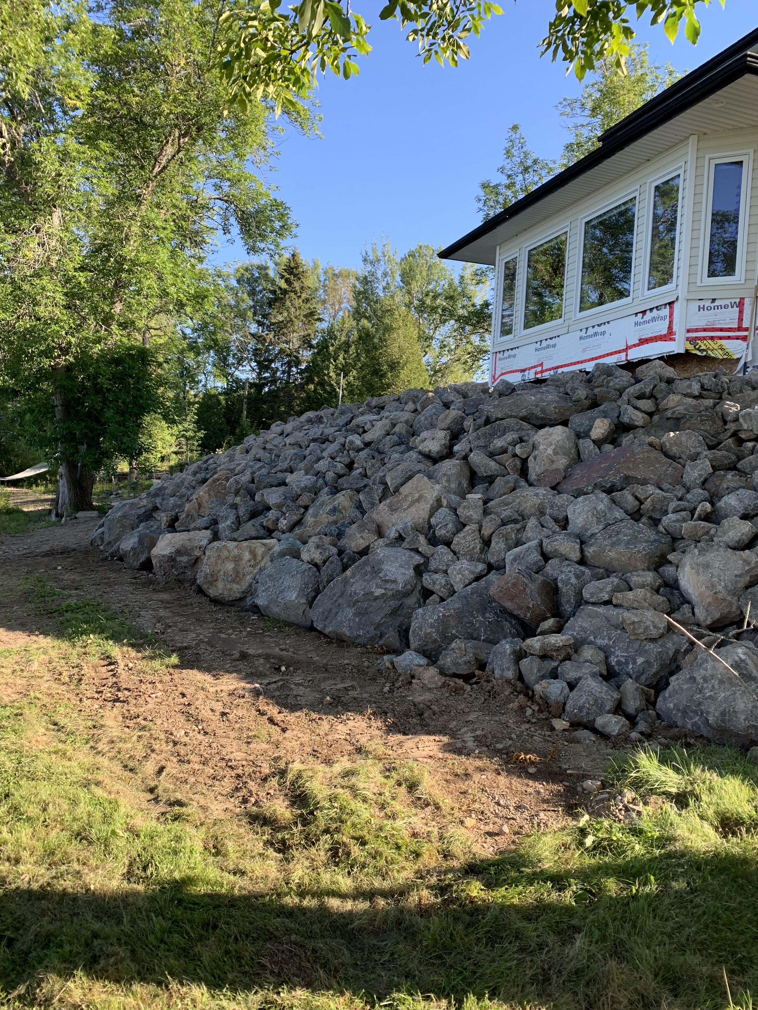 This will all be levelled and tamped with a pea-gravel path and plantings along the foundation walls and top of the rock edge